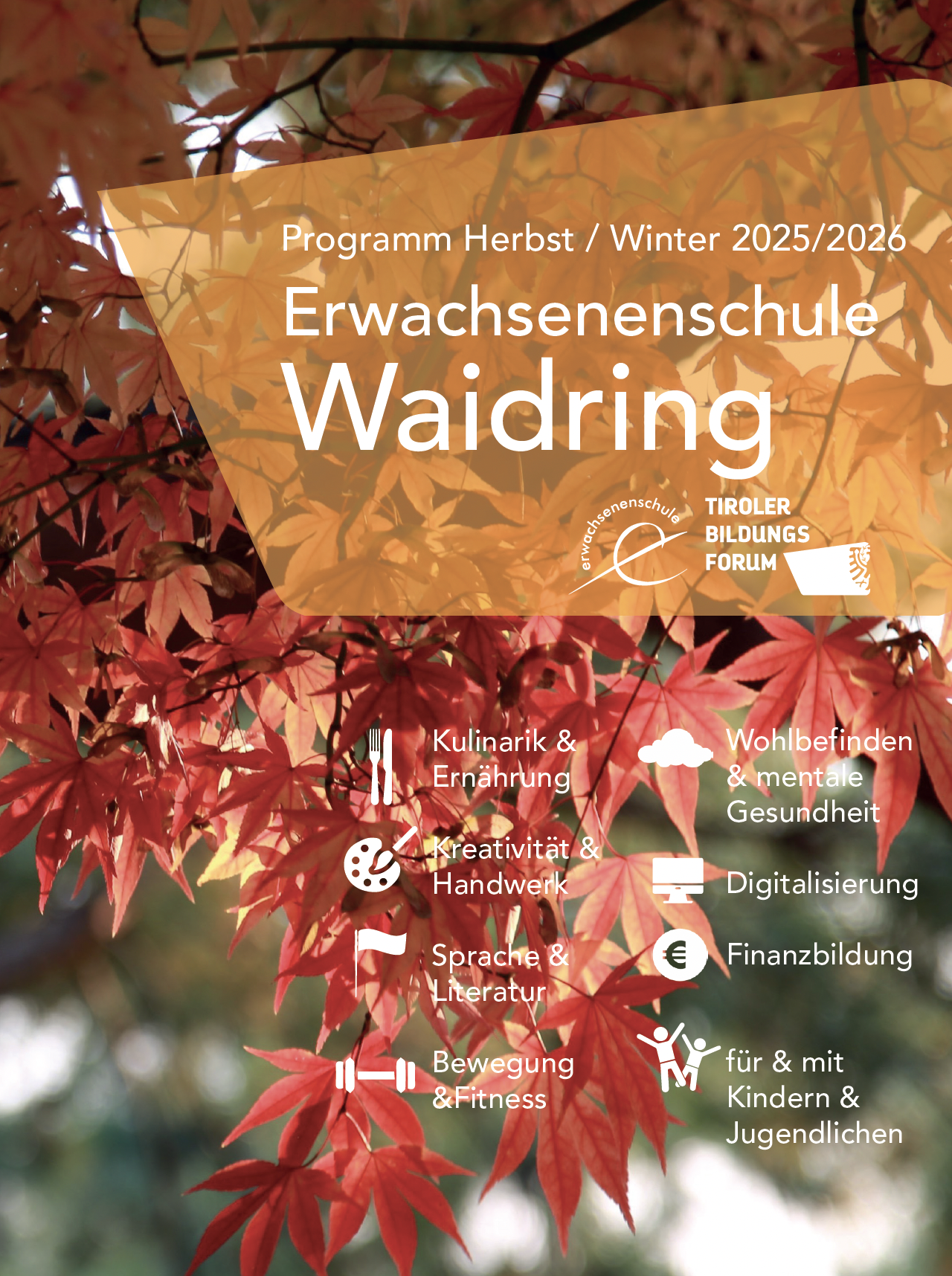 Die Erwachsenenschule Waidring wurde in den 1980er Jahren gegründet und ist Teil des Tiroler Bildungsforums mit Unterstützung der Gemeinde Waidring. Als ein Ort der Begegnung, der Bewegung und des Austausches bietet die Erwachsenenschule allen Interessierten – ob Jung oder Alt, aus Waidring oder der Umgebung – ein buntes Programm an Workshops, Sport- und Bewegungskursen, sowie Vorträgen und leistet somit einen wichtigen Beitrag für unser aller Zusammenleben.