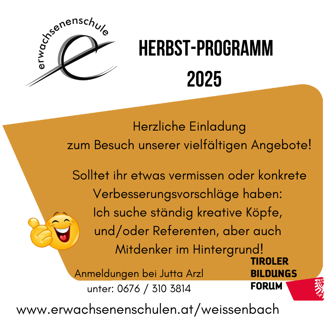 Die ehrenamtliche Leitung der Erwachsenenschule gestaltet dazu ein vielfältiges, wohnortnahes aber auch kostengünstiges Programm. Damit dieses noch mehr den Wünschen der Bevölkerung entspricht, sind alle BewohnerInnen unserer Gemeinde eingeladen, Ideen mitzuteilen oder ihre Kompetenzen als ReferentIn einzubringen.
